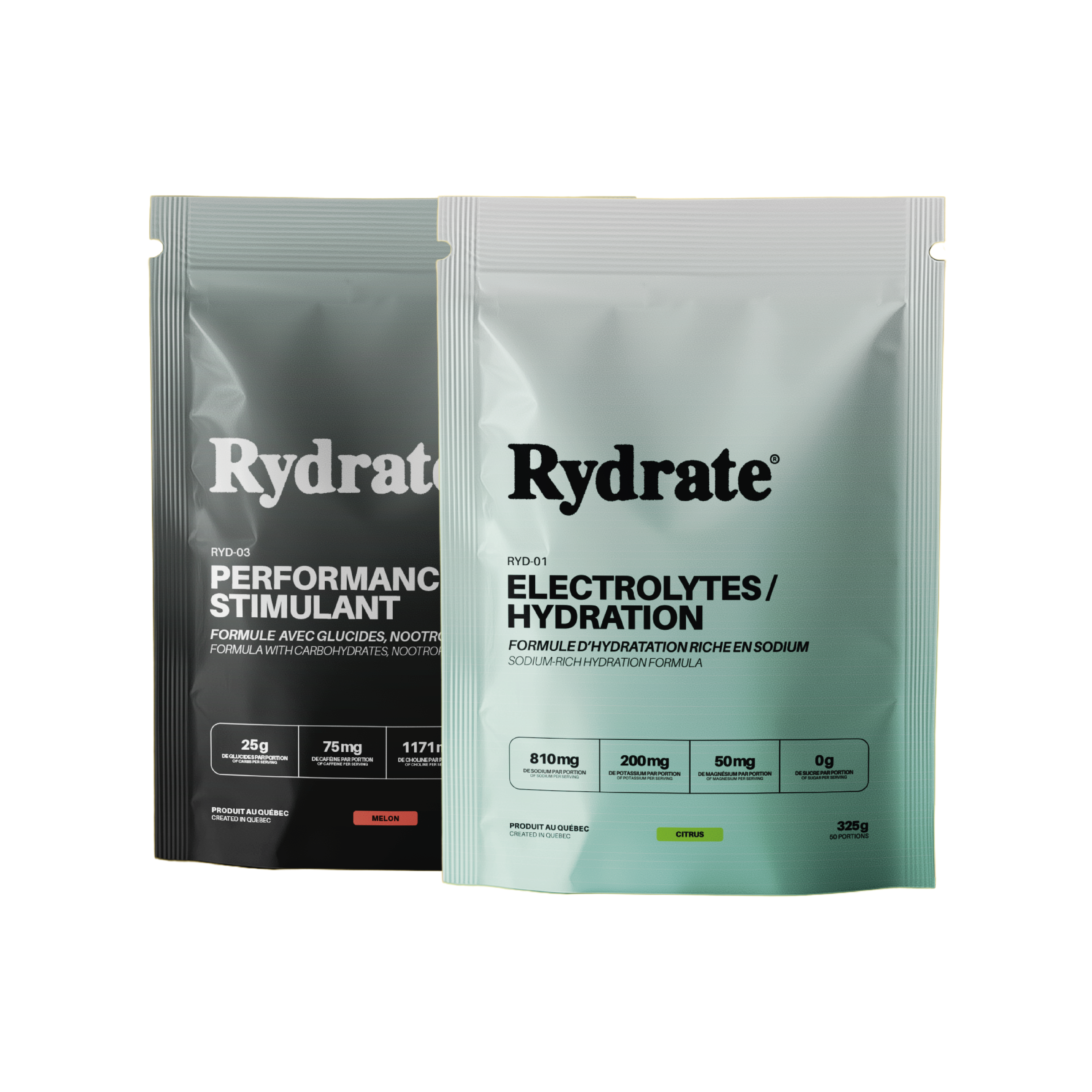 Conçu pour la compétition et les entraînements exigeants, ce duo combine notre formule d’électrolytes sans sucre RYD-01 avec notre formule RYD-03 (glucides avancés + caféine) pour assurer une hydratation optimale, une énergie constante et un focus clair.