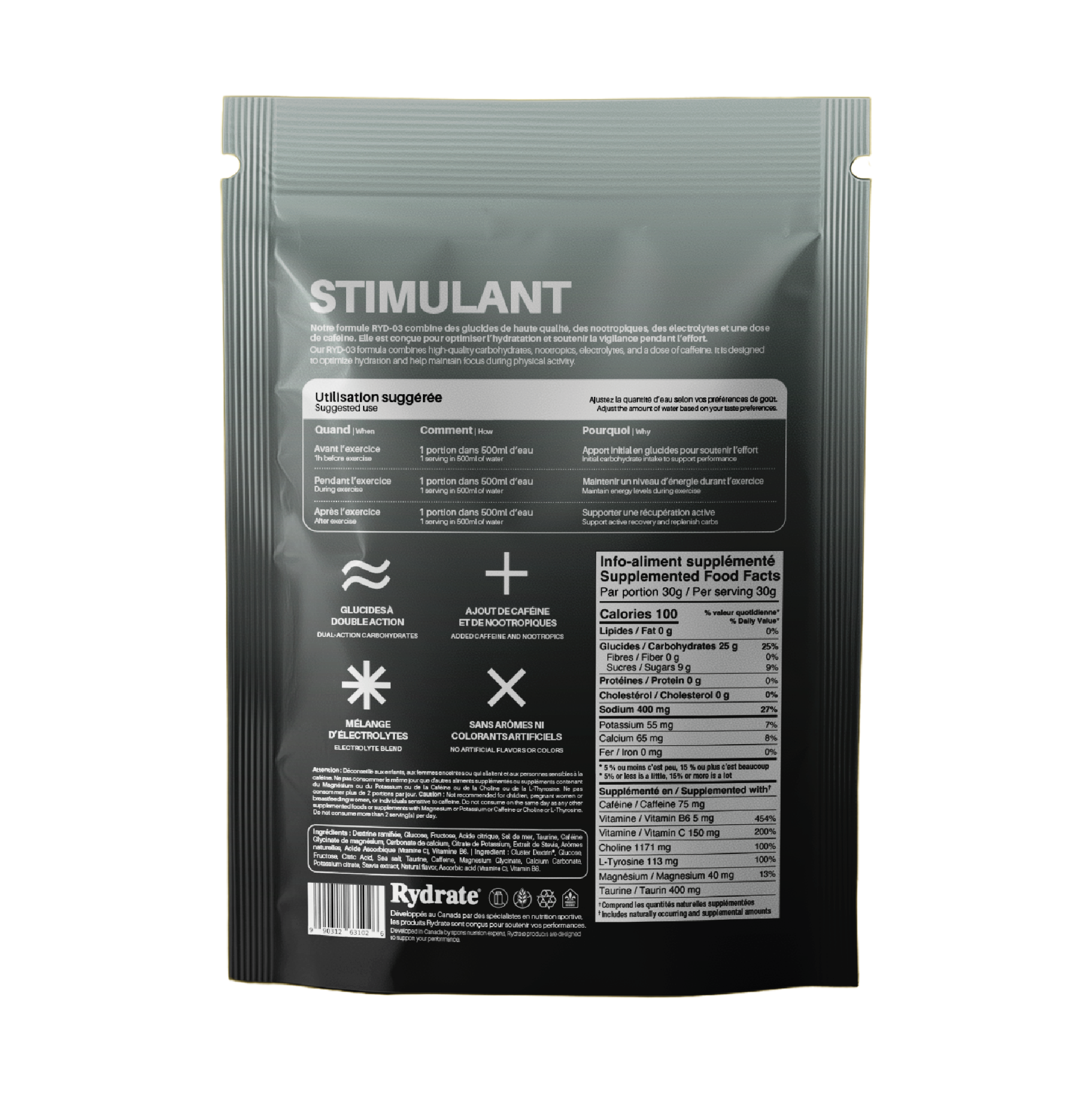 « En pre-workout, RYD-03 remplace les pics rapides par un boost contrôlé. La caféine et les glucides aident à avoir une bonne énergie. »