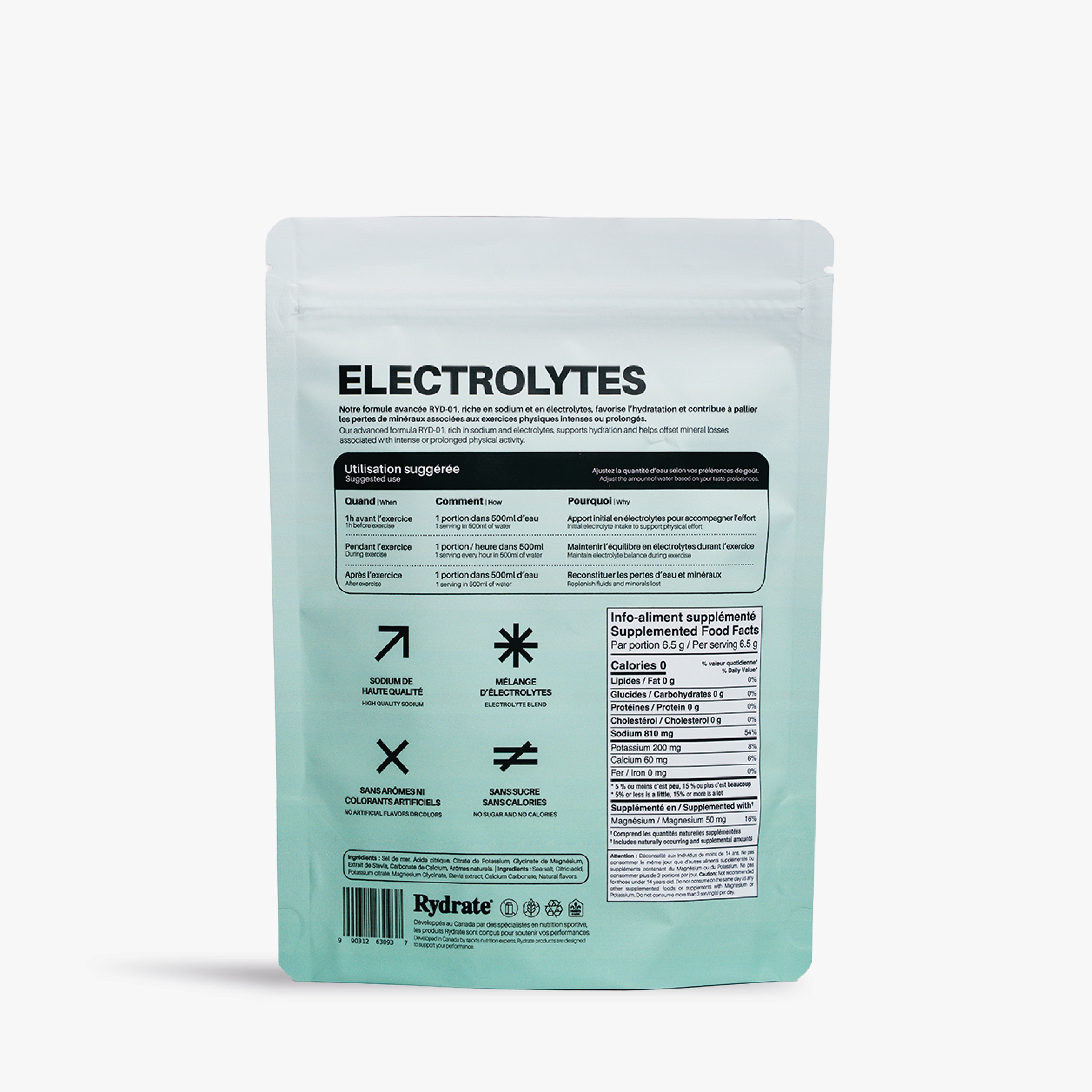 RYD-01: Sea Salt, Citric Acid, Potassium Citrate, Magnesium Glycinate, Stevia Extract, Calcium Carbonate, Natural Flavors.