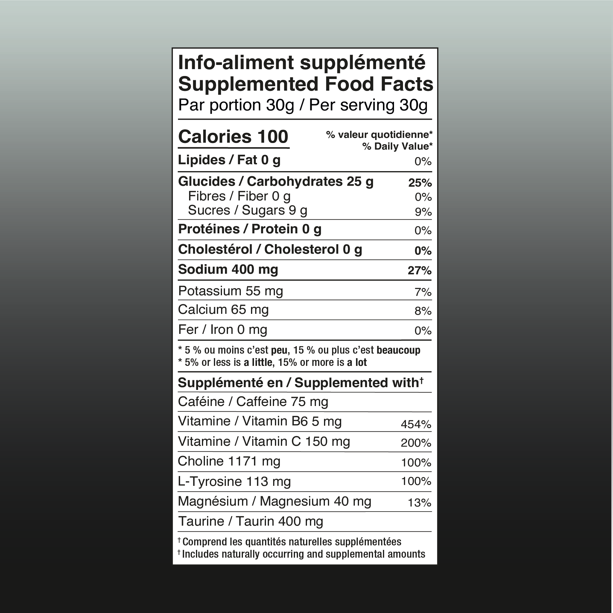 - 1 500ml serving provides 25g of carbohydrates, 400mg of sodium and 75mg of caffeine