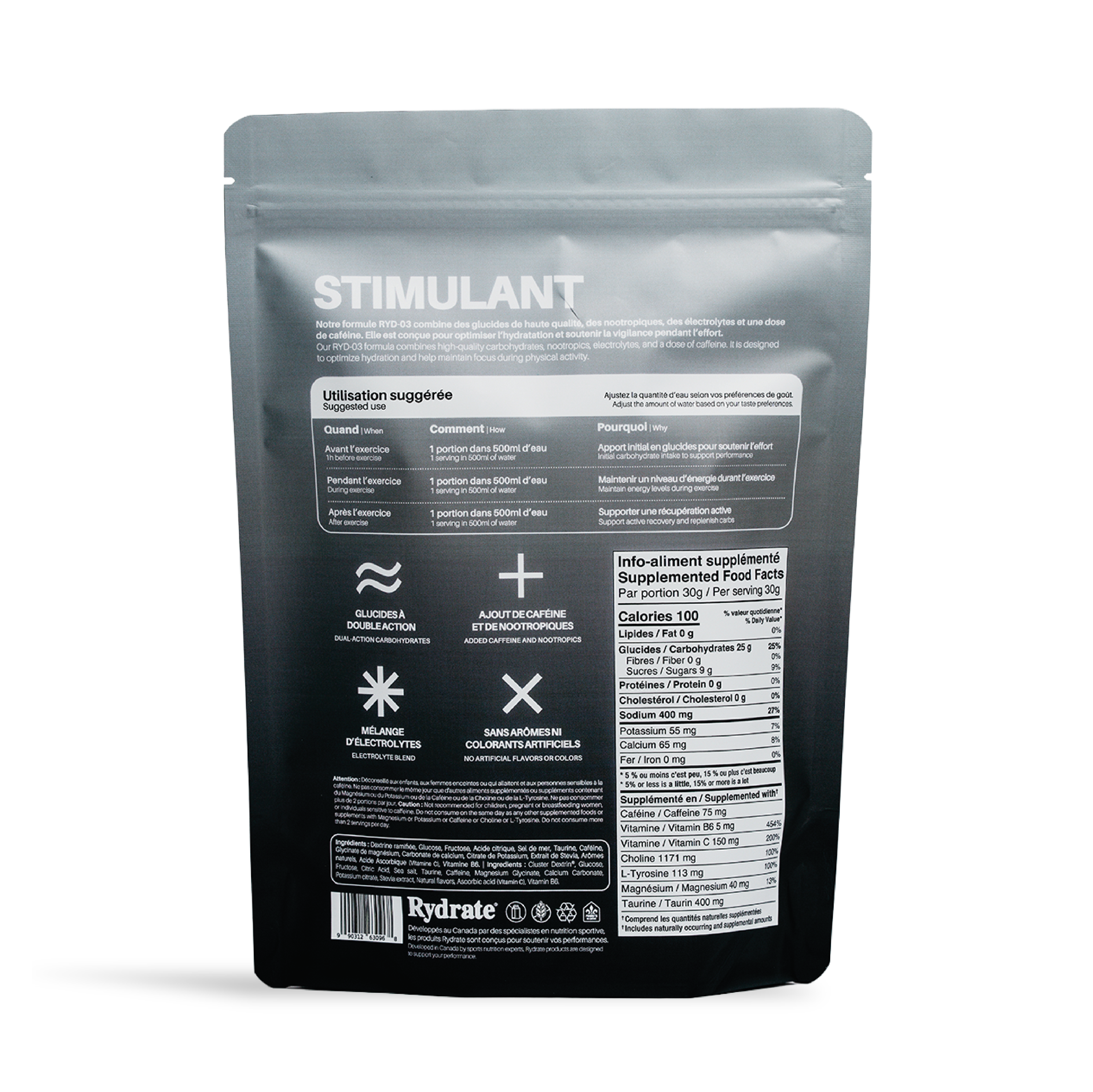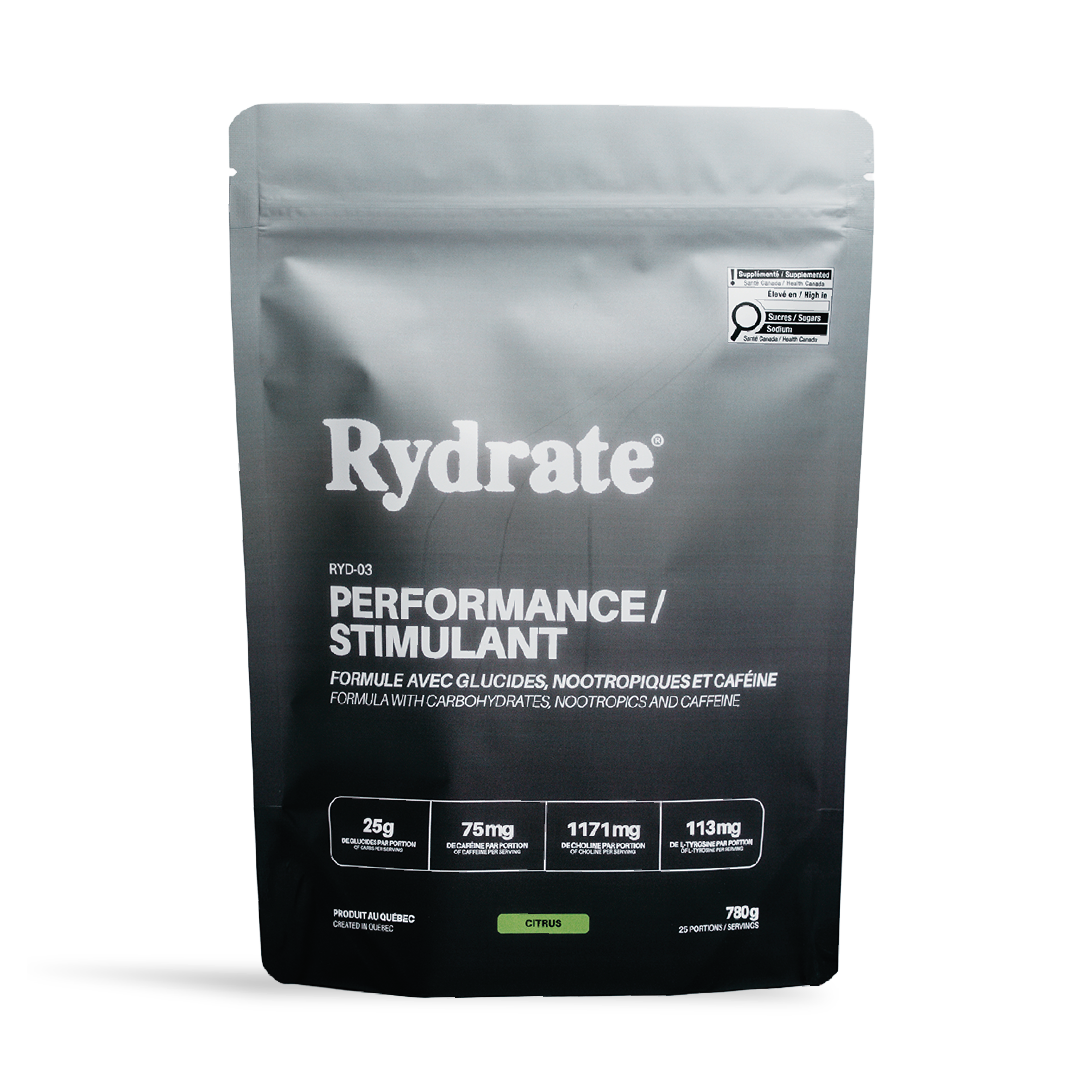 RYD-03 provides the same electrolyte and carbohydrate base as RYD-02, but with a strategic addition of caffeine (75 mg per serving) to boost alertness, focus and performance during sustained exercise.